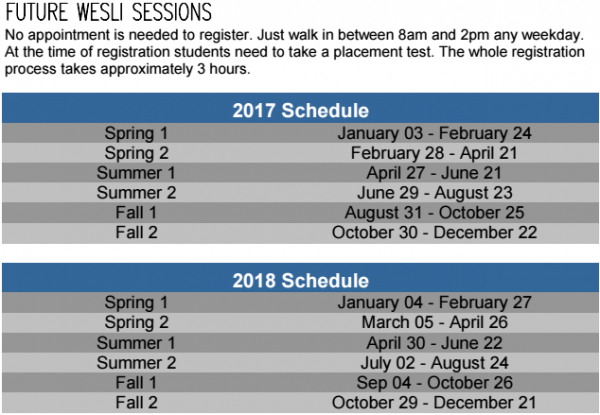 반 편성 및 학사 일정 : WESLI는 초급 수준부터 전문 수준에 이르는 8개의 단계적인 코스를 제공하고 있습니다. (6페이지에 있는 샘플 코스 리스트나 웹사이트에 있는 코스 스케줄을 참고 하십시오.) WESLI의 1개 반은 평균 9명의 학생들로 구성됩니다.
